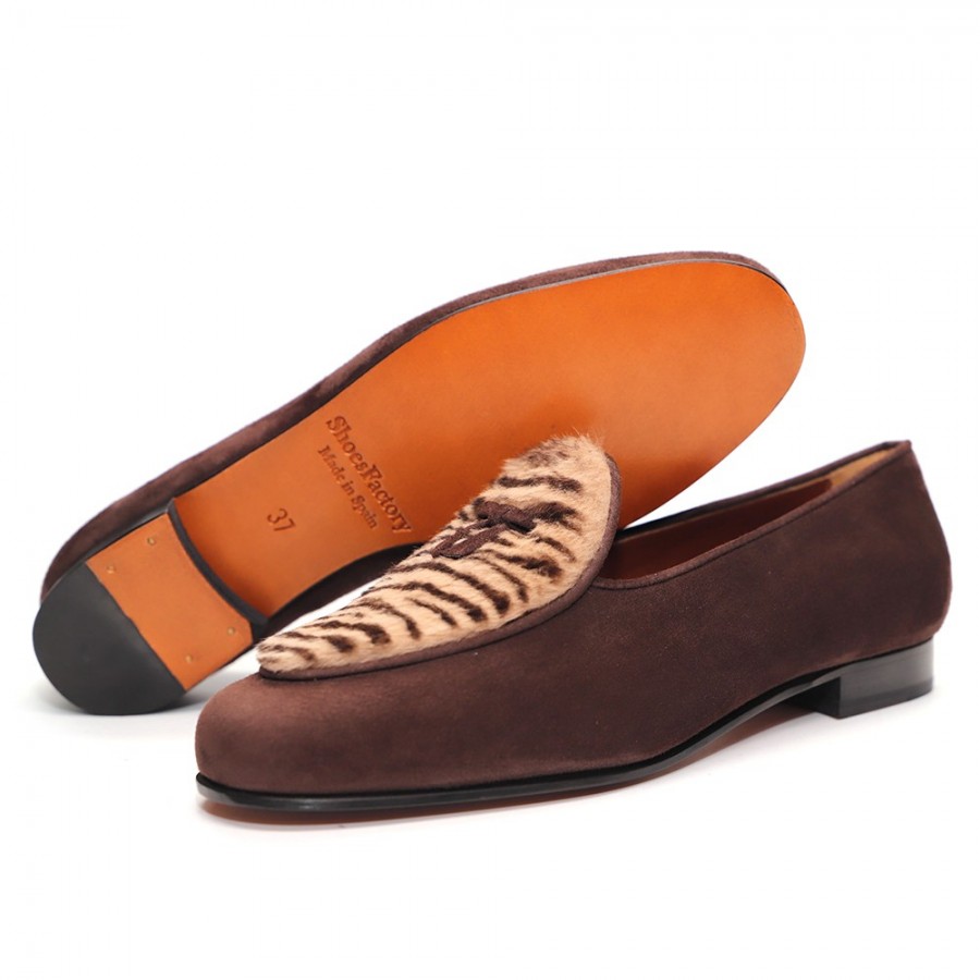 BROWN SUEDE/TIGER, PRINT SUEDE ADORNMENT, SUEDE TRIM, LEATHER LINING, LEATHER SOLE, 14MM HEEL, DUST BAG, SHOE-HORN AND BOX, MADE IN SPAIN