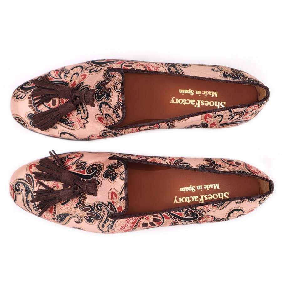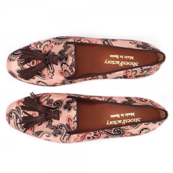 ROSE PAYSLEY, TASSEL ORNAMENT, GROSGRAIN TRIM, LEATHER LINING, LEATHER SOLE, 14MM HEEL, DUST BAG, SHOE-HORN AND BOX, MADE IN SPAIN
