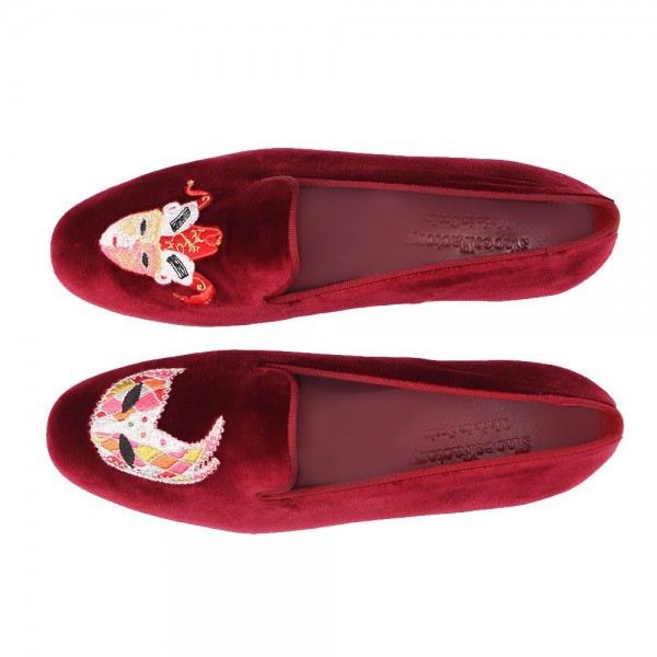 BORDEAUX VELVET, MASK EMBROIDERY, GROSGRAIN TRIM, LEATHER LINING, LEATHER SOLE, 14MM HEEL, DUST BAG, SHOE-HORN AND BOX, MADE IN SPAIN