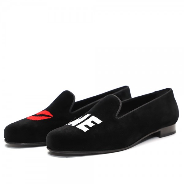 BLACK VELVET, KISS ME EMBROIDERY, GROSGRAIN TRIM, LEATHER LINING, LEATHER SOLE, 14MM HEEL, DUST BAG, SHOE-HORN AND BOX, MADE IN SPAIN