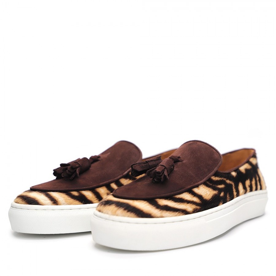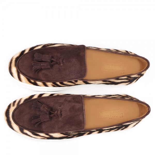 PONY TIGER, BROWN SUEDE, TASSEL ORNAMENT, SUEDE TRIM, LEATHER LINING, RUBBER SOLE, DUST BAG, SHOE-HORN AND BOX, MADE IN SPAIN