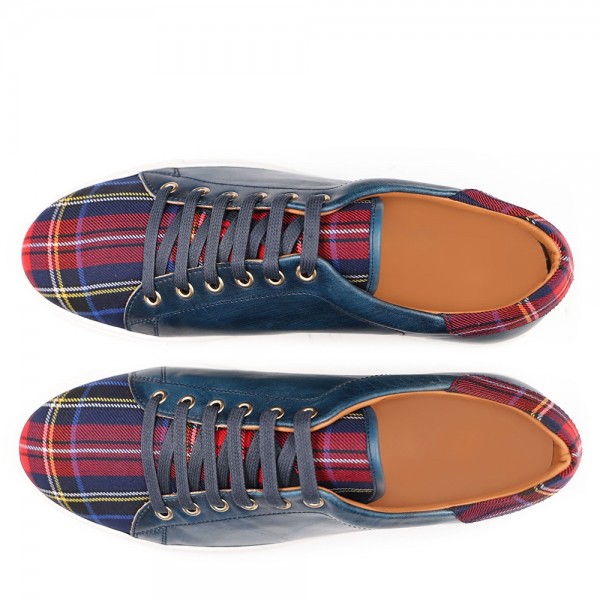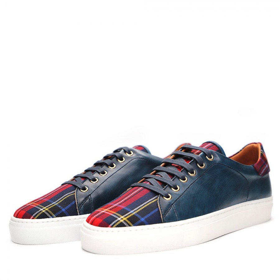 RED/NAVY ROYAL STEWART, NAVY CALF, LEATHER LINING, NAVY LACES, RUBBER SOLE, DUSTBAG, SHOEHORN AND BOX, MADE IN SPAIN