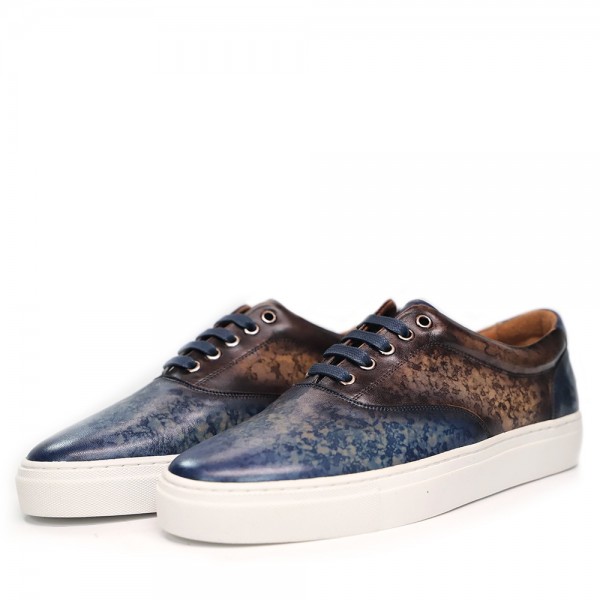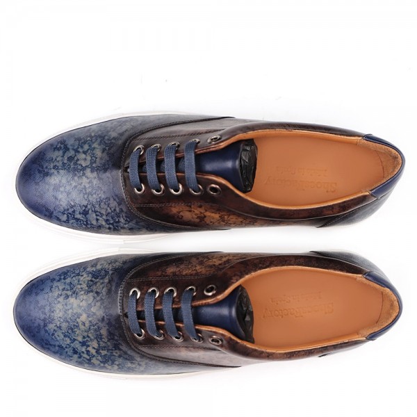 GREEN STRIPED PATINA, CHESTNUT CHECKS, LEATHER LINING, BROWN LACES, RUBBER SOLE, DUST BAG, SHOE-HORN AND BOX, MADE IN SPAIN