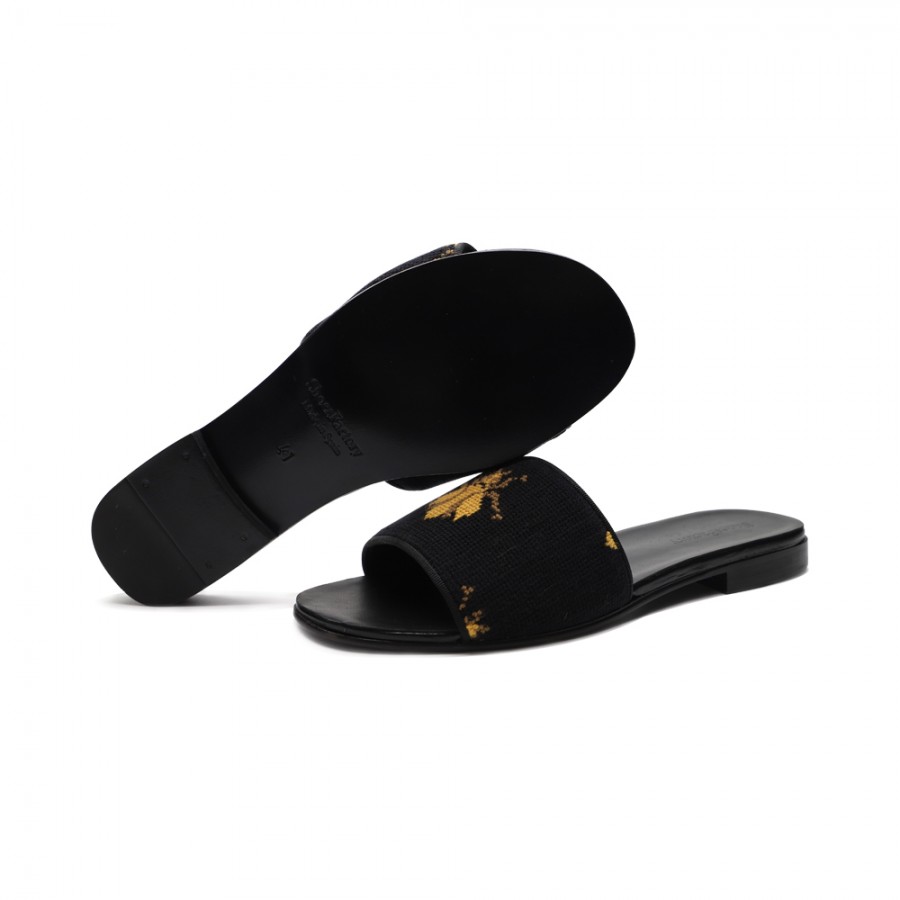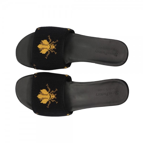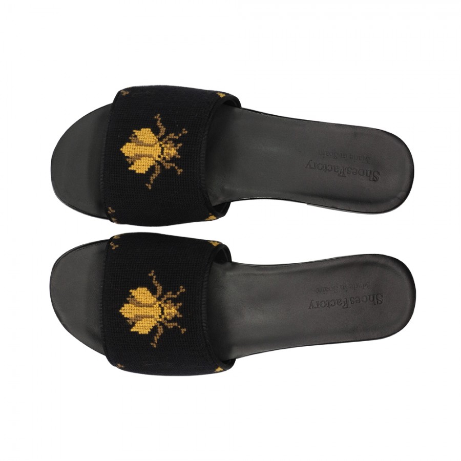 BEE NEEDLEPOINT, GROSGRAIN TRIM, LEATHER LINING, LEATHER SOLE, 11MM HEEL, DUST BAG, SHOE-HORN AND BOX, MADE IN SPAIN, HANDMADE TO ORDER IN 21 DAYS