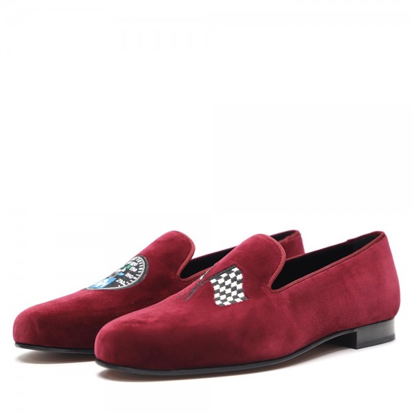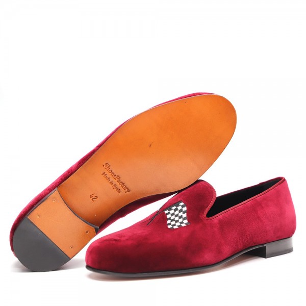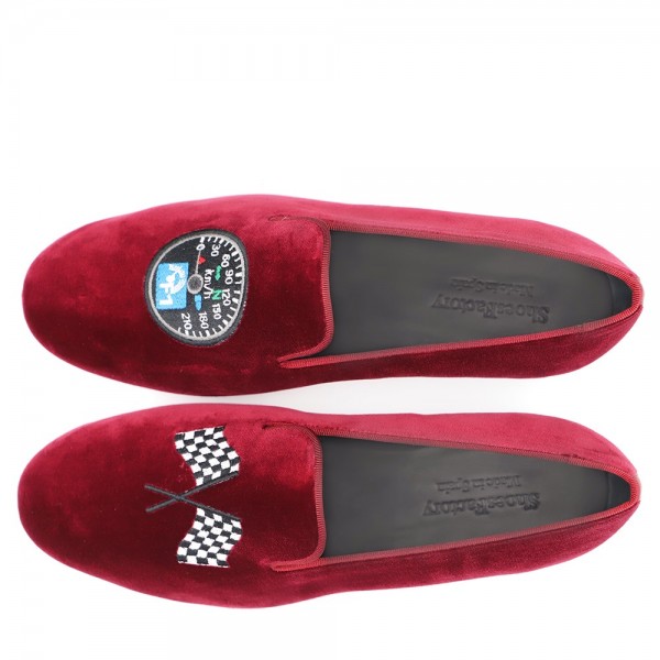 TERCIOPELO BURDEOS, BORDADO CUENTA KM/BANDERAS, RIBETE GROSGRAIN, FORRO PIEL, PISO SUELA, TACON 16MM, BOLSA PARA POLVO, CALZADOR Y CAJA, HECHO EN ESPAÑA