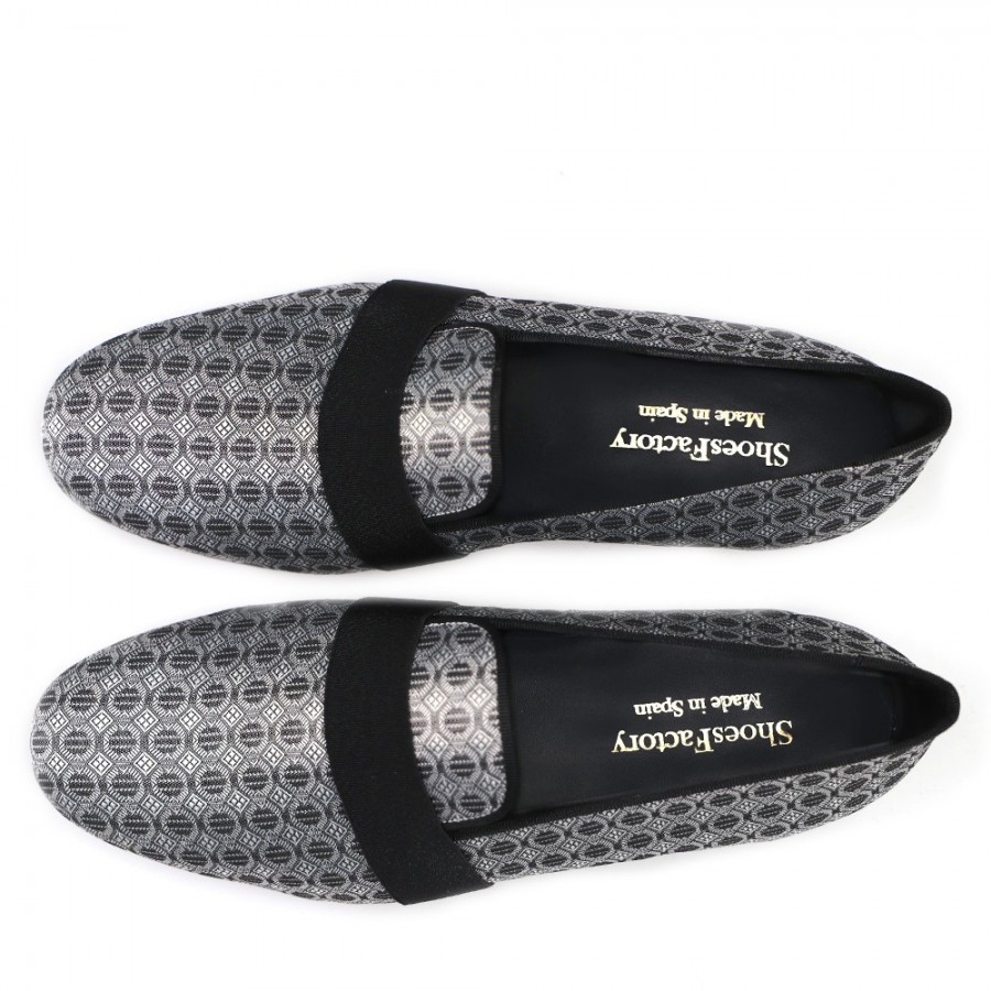 LUNARES GRIS, ADORNO ELASTICO, RIBETE GROSGRAIN, FORRO PIEL, PISO SUELA, TACON 16MM, BOLSA PARA POLVO, CALZADOR Y CAJA, HECHO EN ESPAÑA